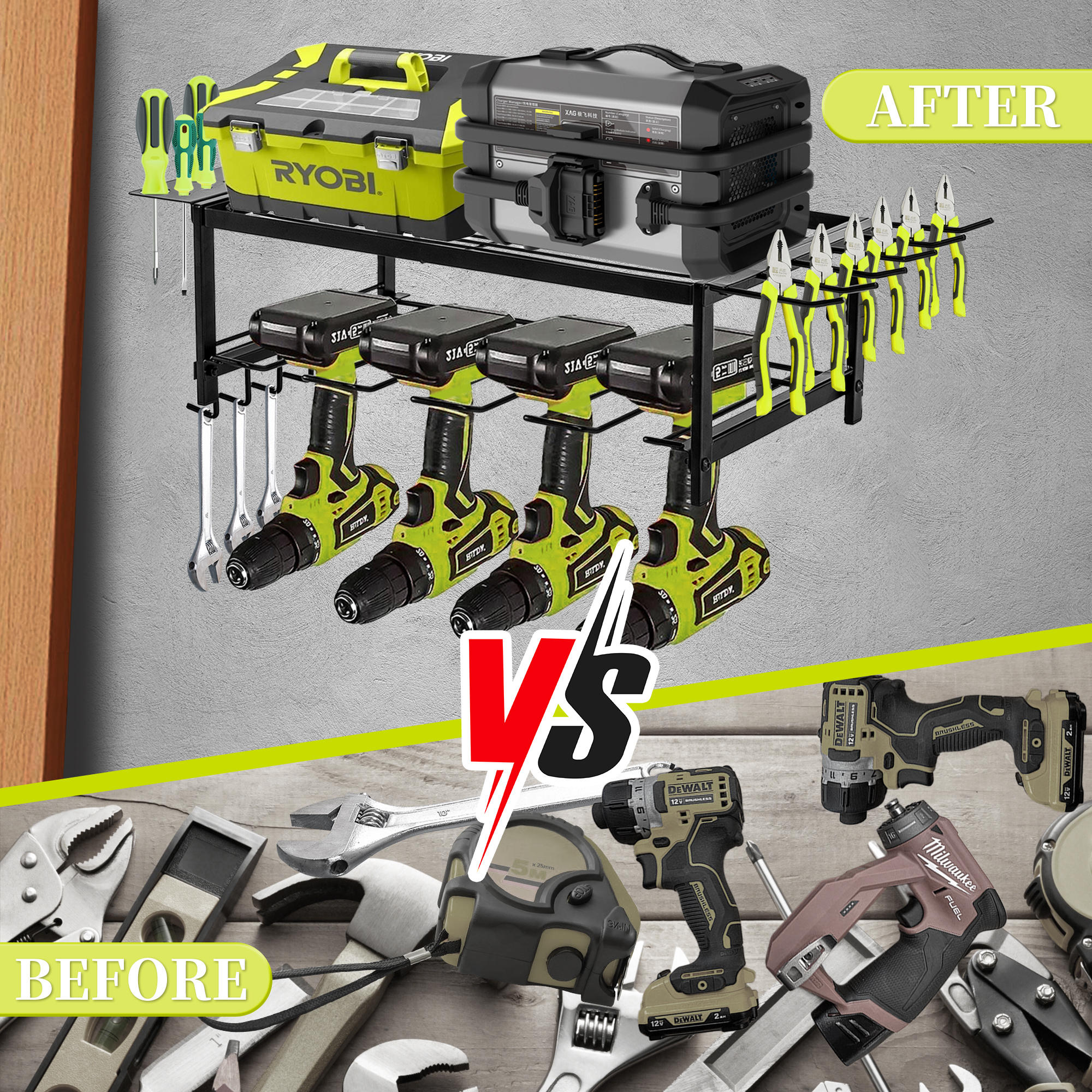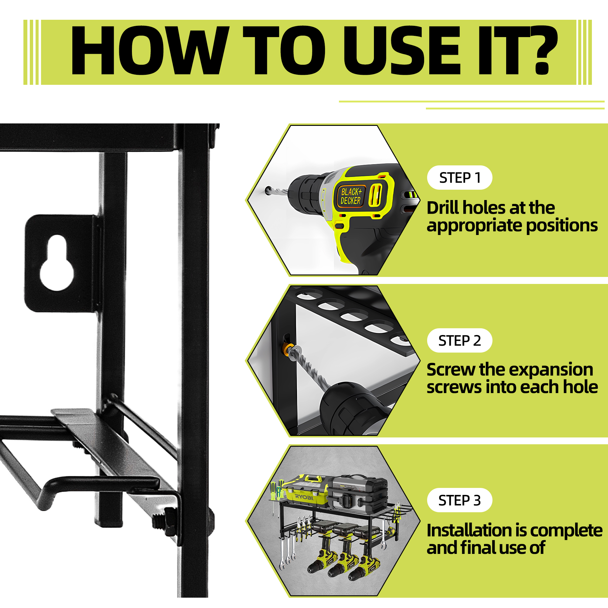 This is exactly the solution I needed to organize my garage workbench space. Previously, all my power tools were piled on the countertop, but now I can fully utilize the space above the counter to store everything. Installation was simple and straightforward, with all necessary hardware included in the package to securely mount the tool rack to the wall. Since only one side could be anchored to the stud, I had to use wall anchors for the other side. Ideally, the mounting hole spacing should be 16 inches, but given the product's multiple size options, strictly adhering to this restriction proved impractical in real-world installation. Overall, I'm very satisfied with this purchase—it's kickstarted my garage organization journey.