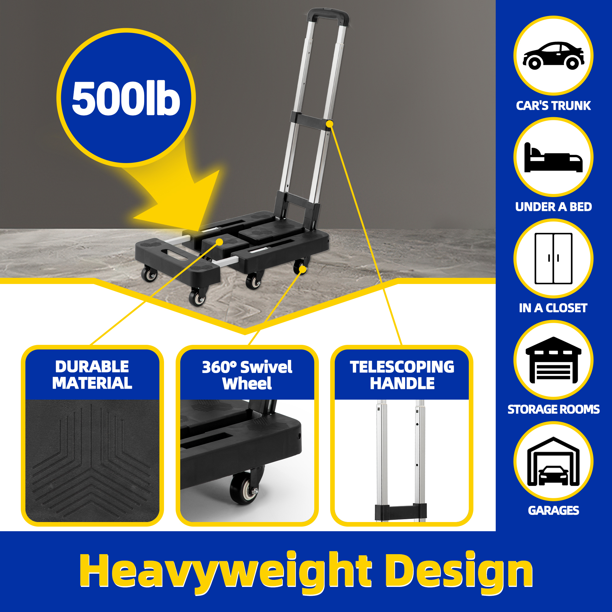 I bought this for my newly opened home office, making it much easier to move storage cabinets and items from the UPS store. While the platform could be larger, it's compact and lightweight.I keep it in my trunk at all times.