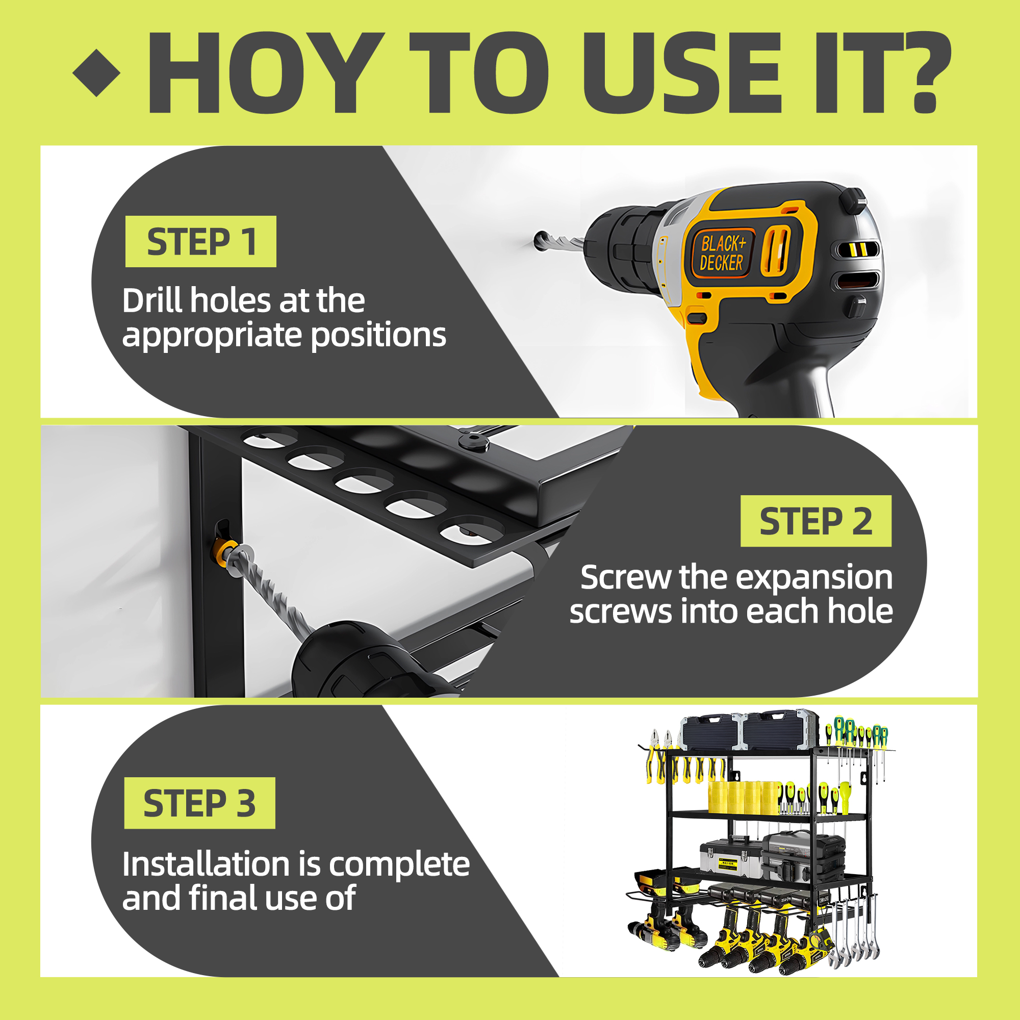I've been searching for a solution to organize my cordless tools. This storage rack comes in two sizes, and I opted for the larger model. Once assembled, it accommodates tools, multiple chargers, and slots for several screwdrivers, while also allowing a toolbox to sit on the bottom shelf. The craftsmanship is excellent, and assembly was quite straightforward. Recommendation: When assembling,avoid tightening all screws at once. Position each piece individually and check for vertical alignment. Since the mounting hole spacing isn't precisely 16 inches, I added extra mounting strips to ensure a secure bond with the wall—this product carries significant weight, and relying solely on drywall anchors isn't the best solution.Overall, I'm extremely satisfied with this purchase and highly recommend