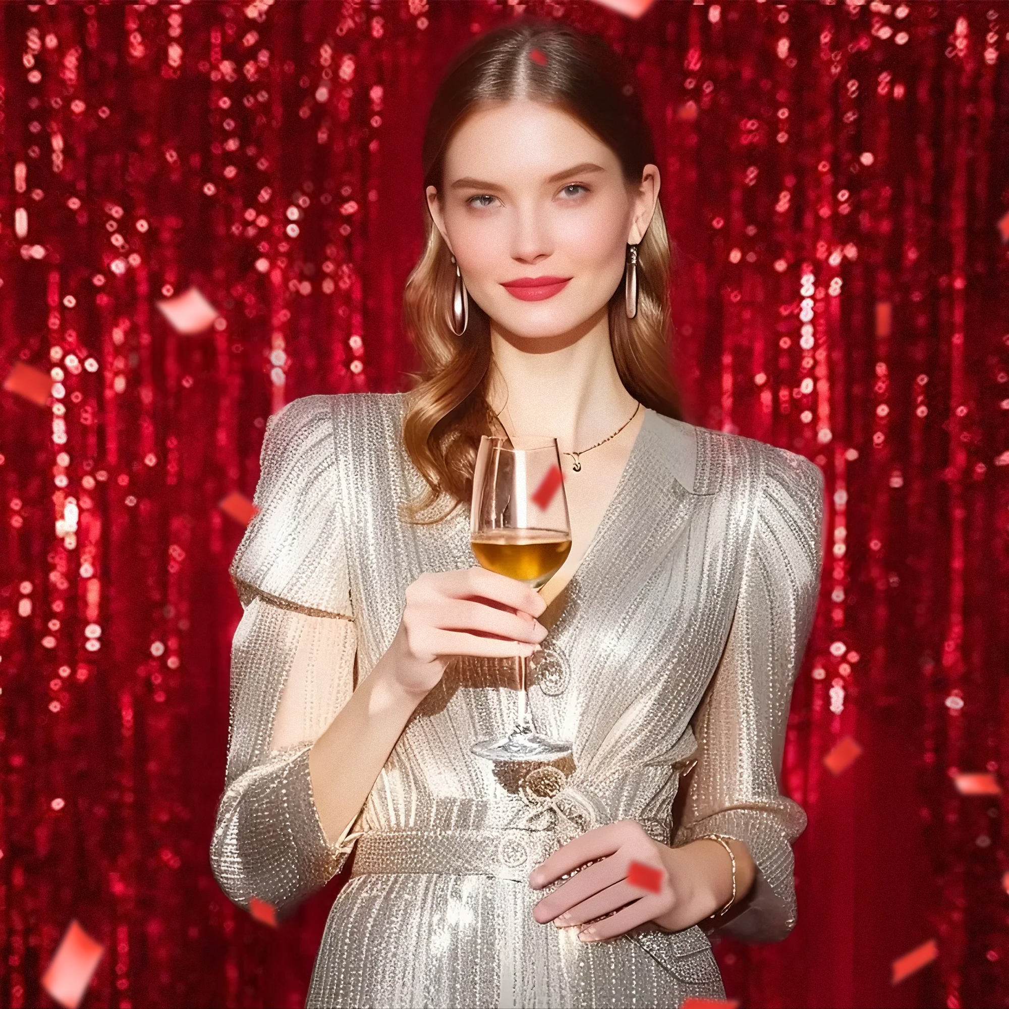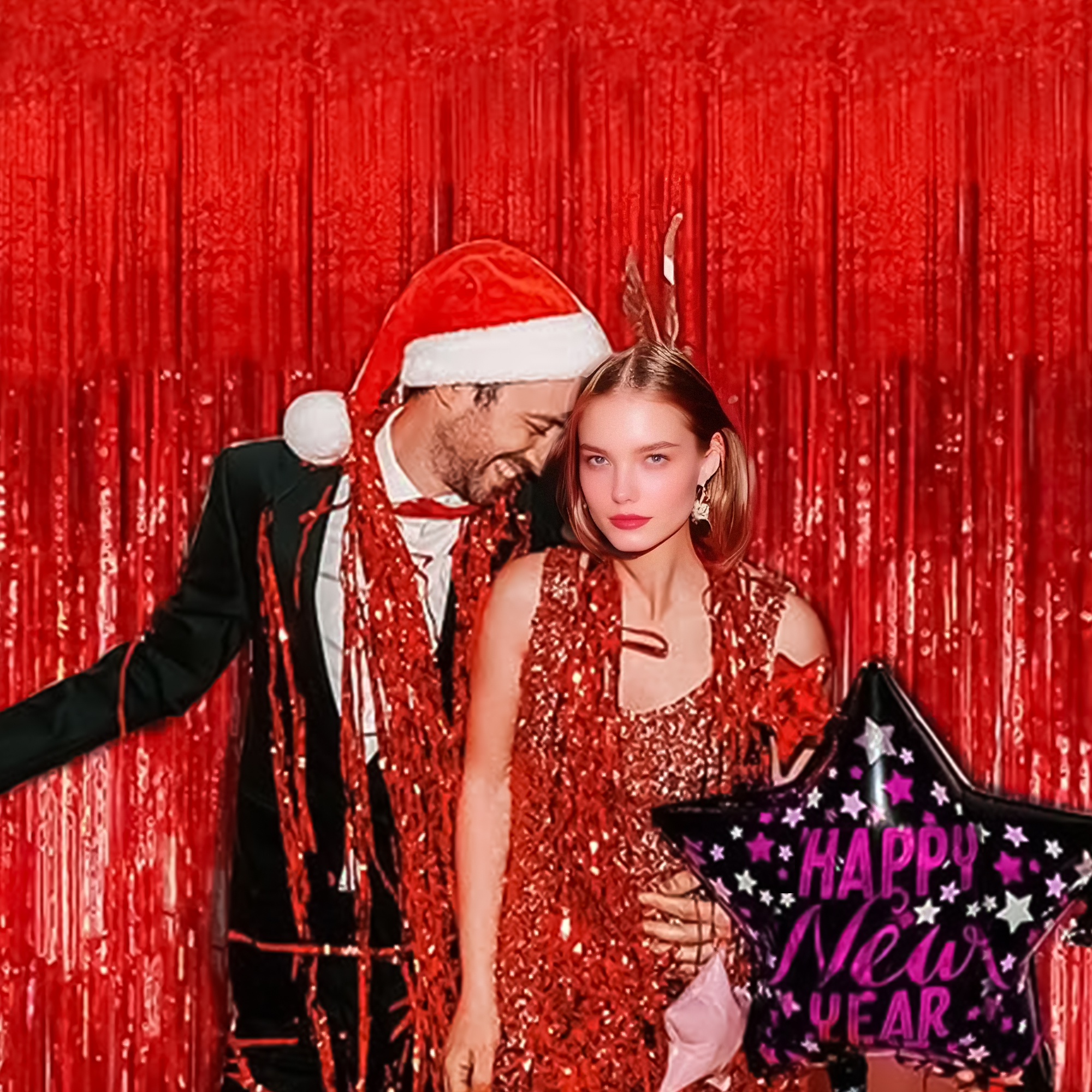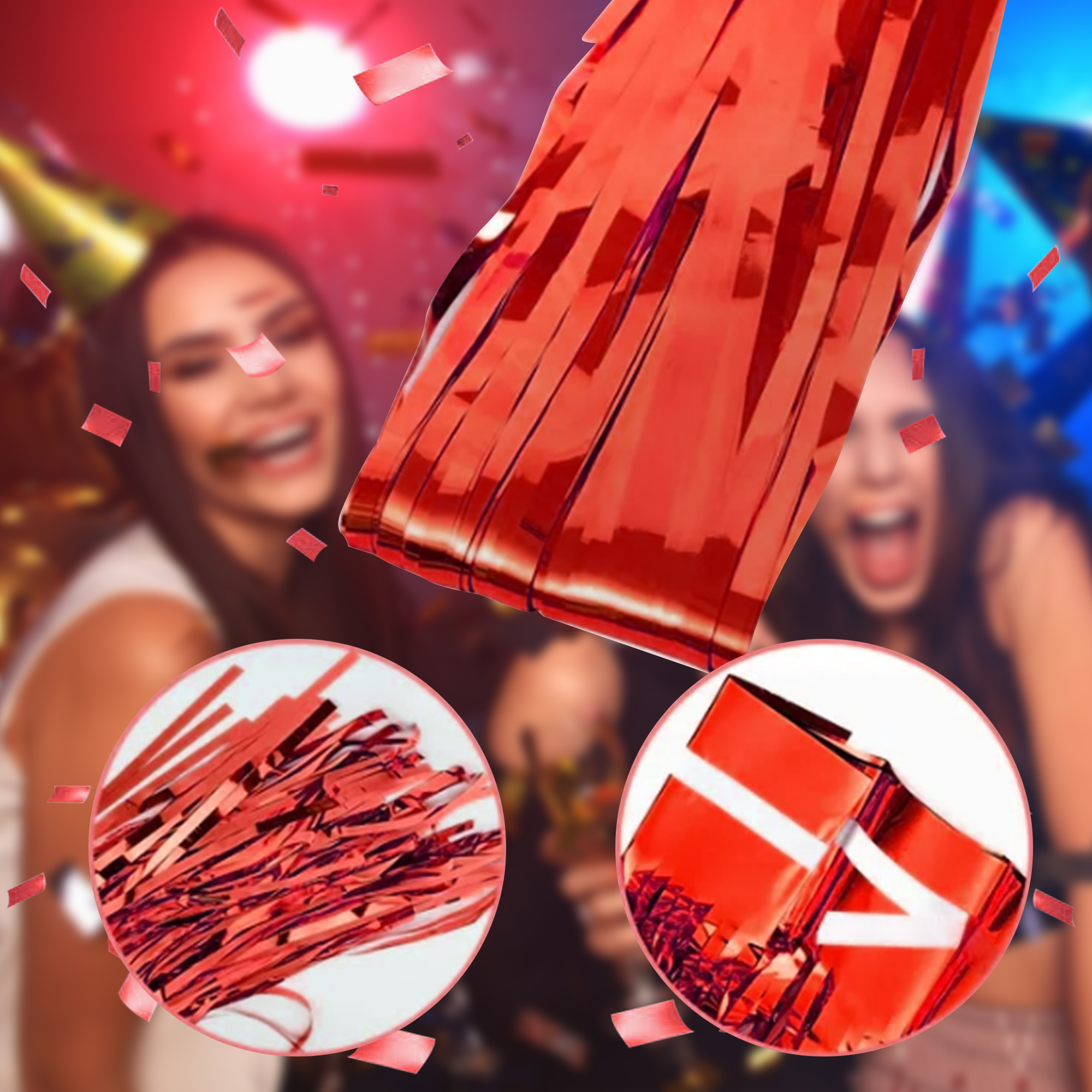 - 1️⃣【 Eye-Catching Holo Sparkle】 – Shiny red foil fringe reflects rainbow hues (silver/pink/purple) under light, creating a mesmerizing backdrop for photos and events.